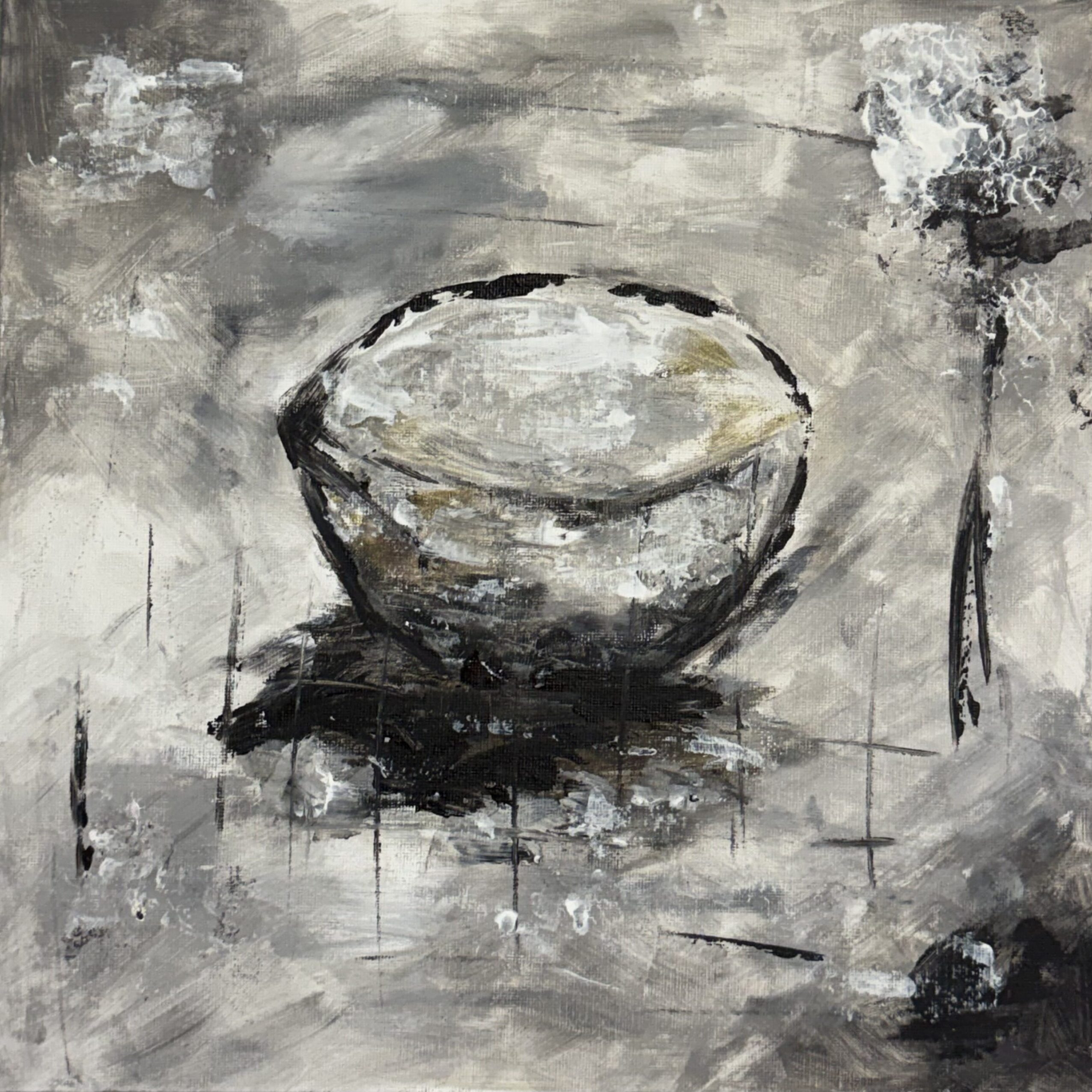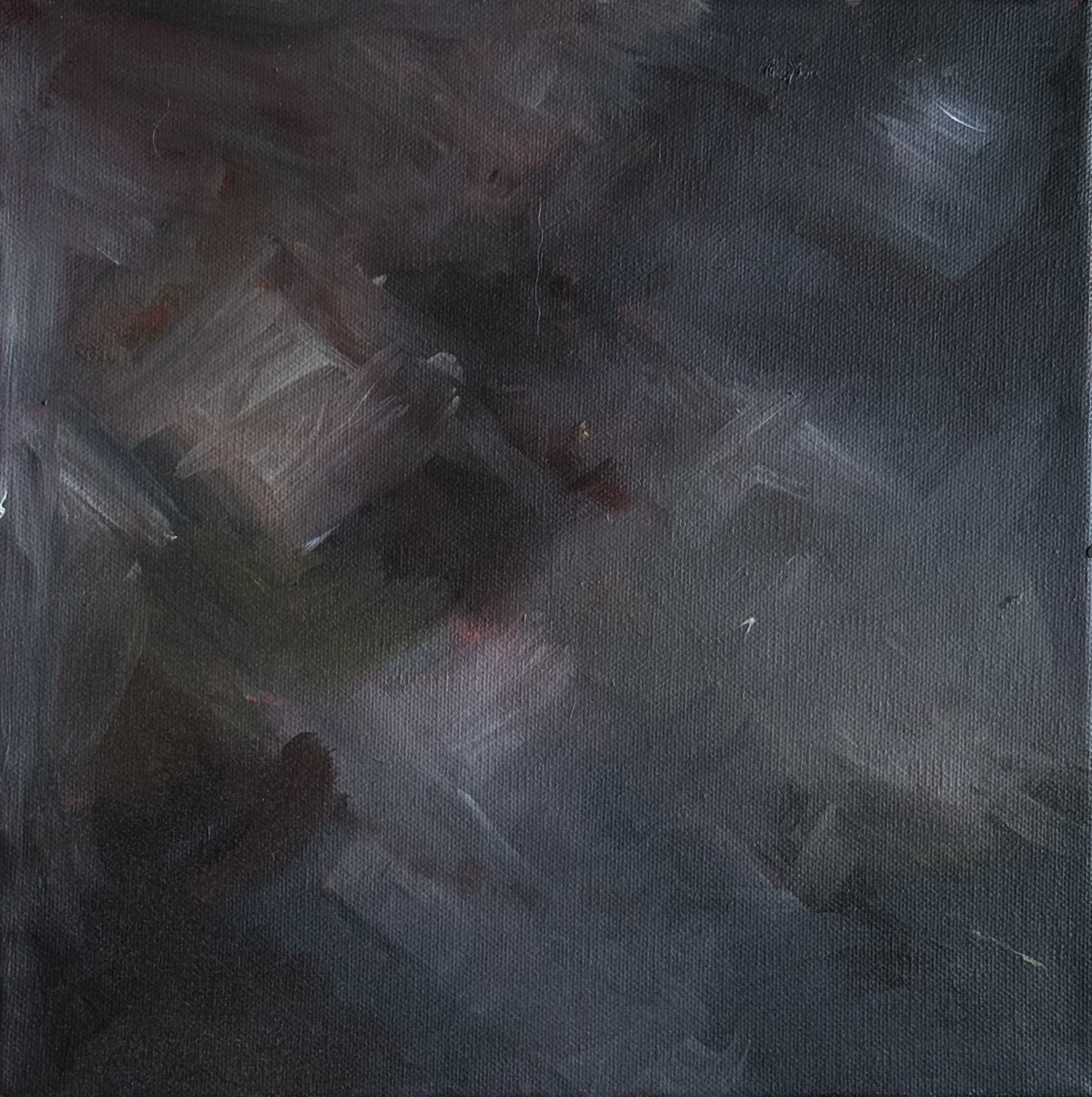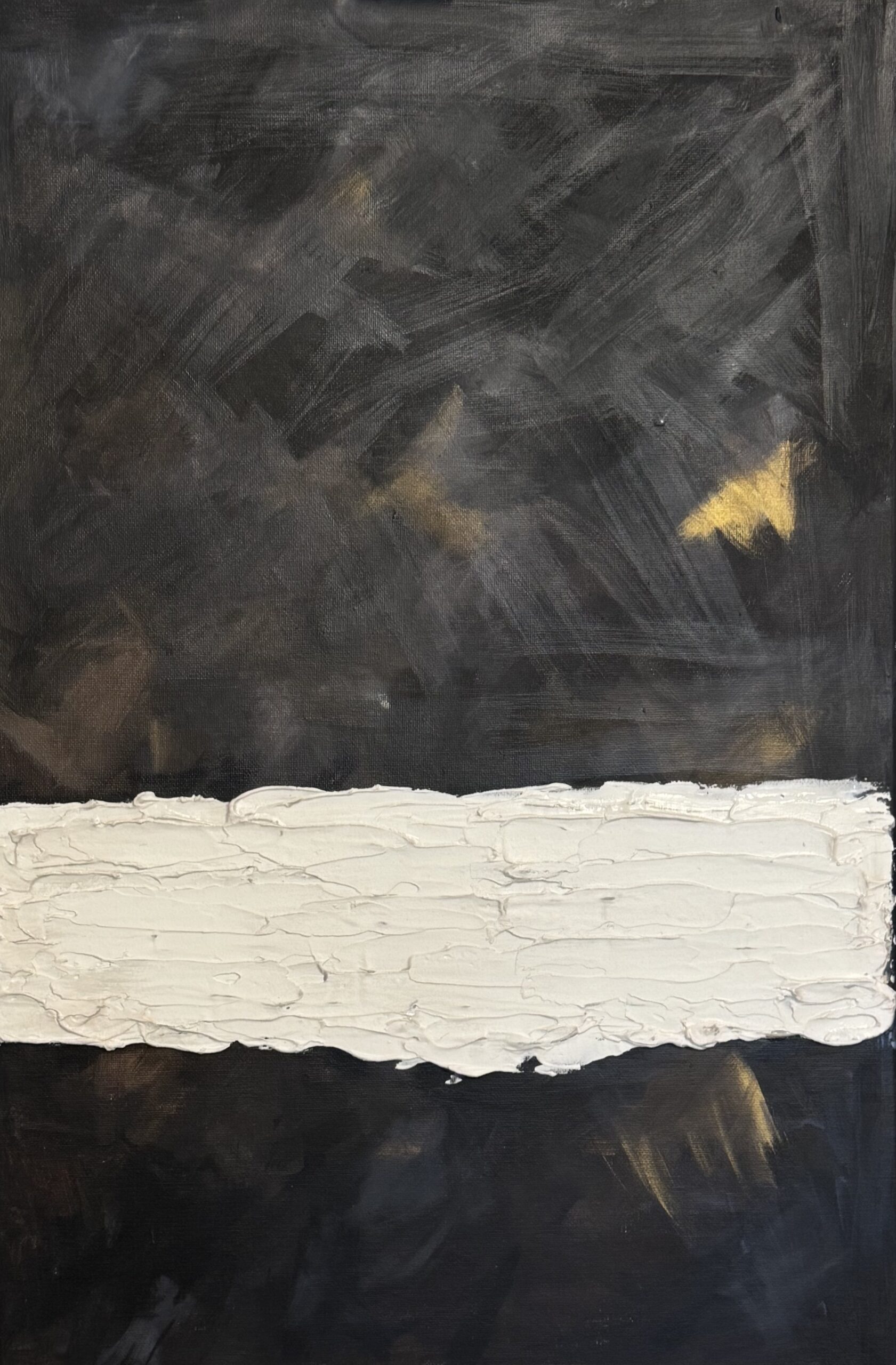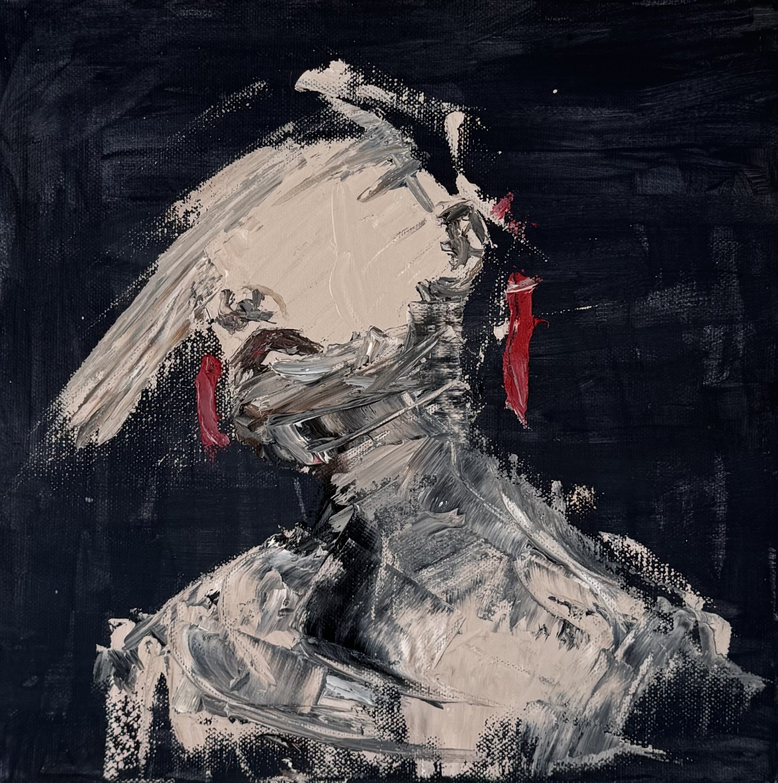 I mötet mellan ljus och mörker uppstår en stilla skärningspunkt. Ansiktet vänder sig bort, men tankarna rör sig inåt – mot något som ännu inte fått form. Tavlan utforskar den inre plats där motsatser möts: styrka och sårbarhet, kontroll och kaos. I denna punkt finns både konflikt och balans.