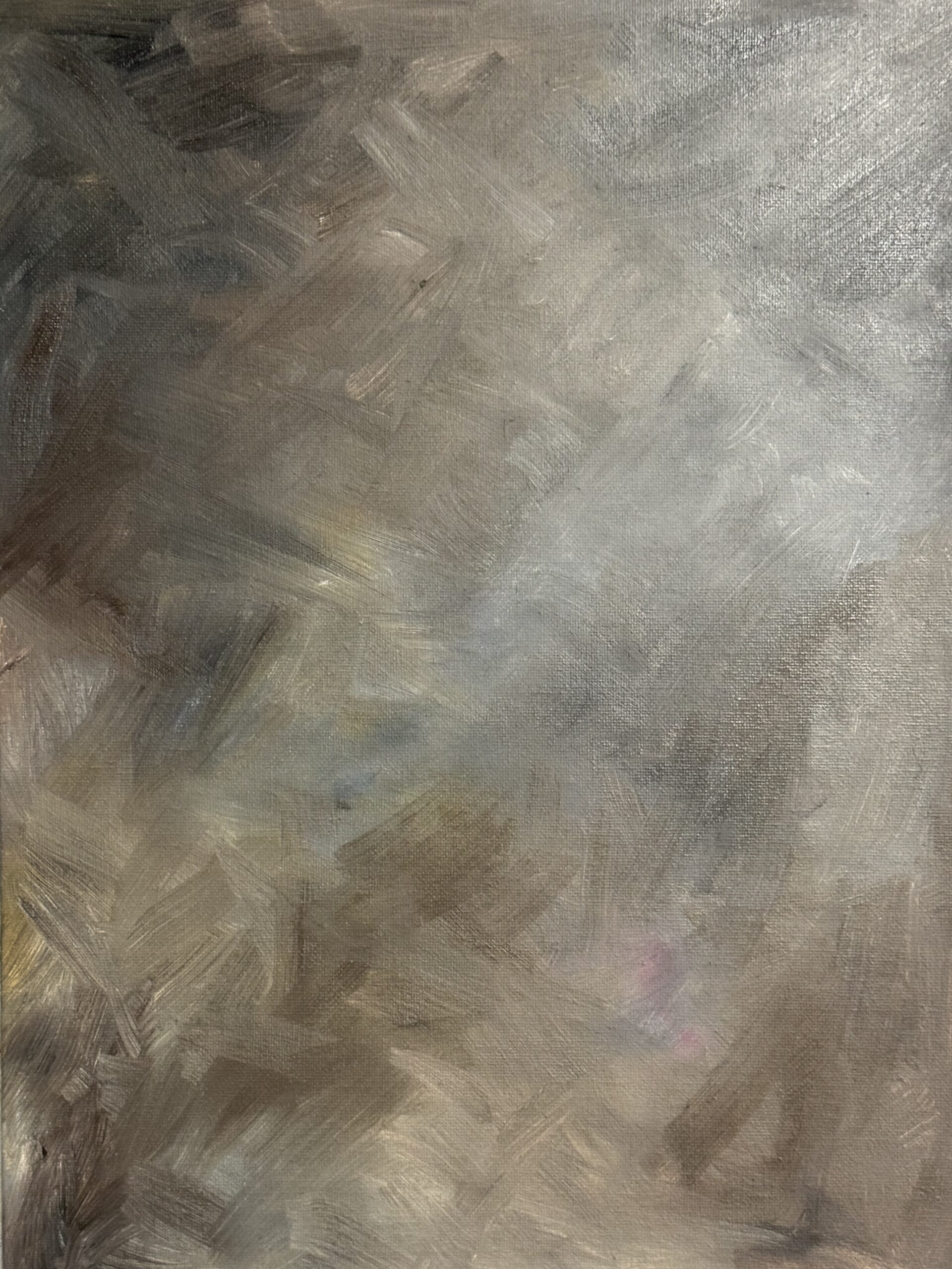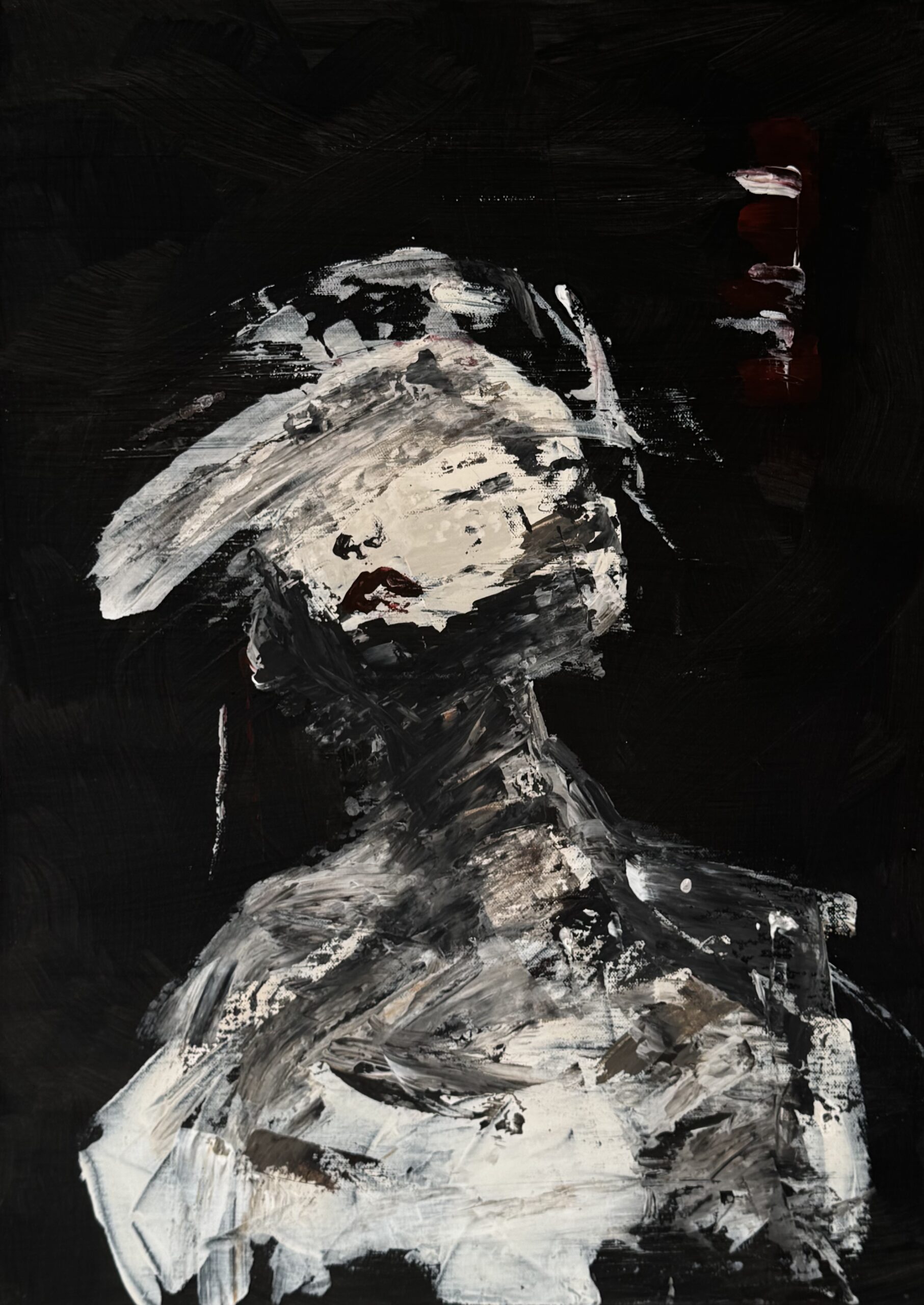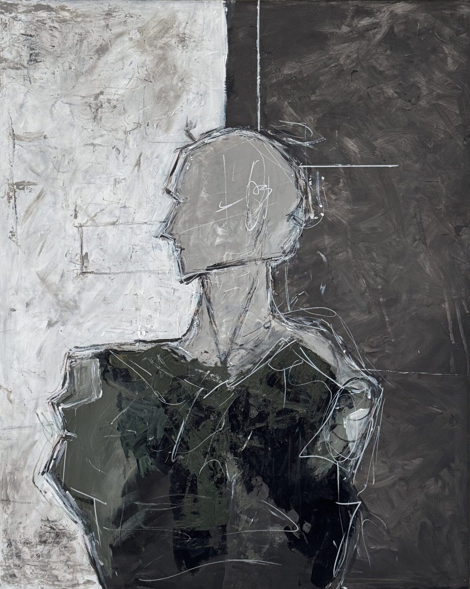 Tavlan skildrar en mänsklig profil placerad i skärningspunkten mellan ljus och mörker. Den grova, nästan rastlösa penselföringen och de skissartade linjerna ger intryck av något ofullbordat – som om identiteten fortfarande formas.