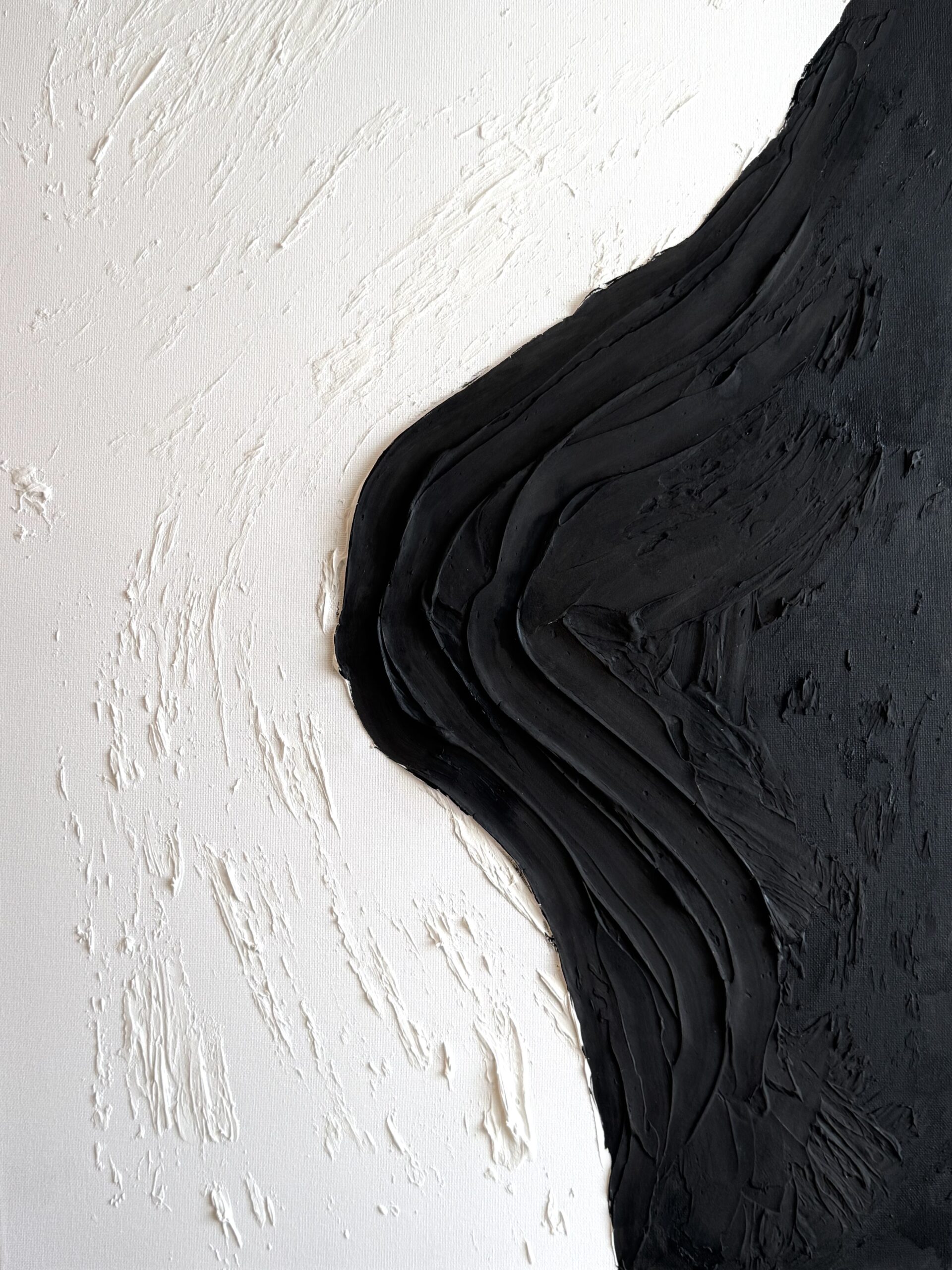 En studie i rörelse och stillhet där det svarta breder ut sig över ytan med både kraft och mjukhet. Den taktila strukturen fångar ljuset och förändras beroende på betraktarens position. I mötet mellan mörker och tomrum uppstår ett levande flöde – rått, organiskt och närvarande.