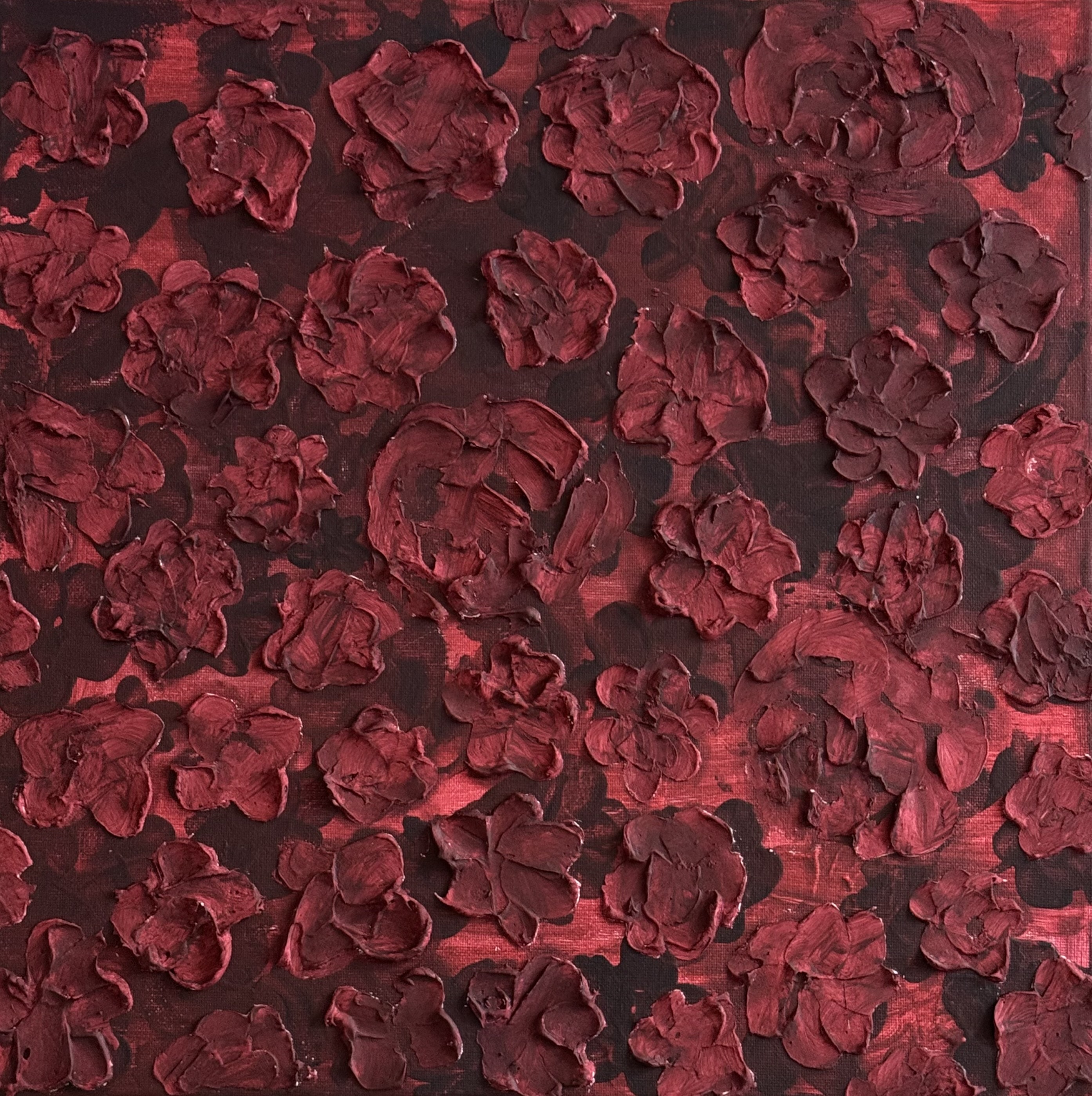 Rosebed är en studie i kontraster. Det röda – intensivt och levande – möter det mörka djupet under ytan. Blommorna bär både skönhet och tyngd, som om de svävar mellan ömhet och kraft.