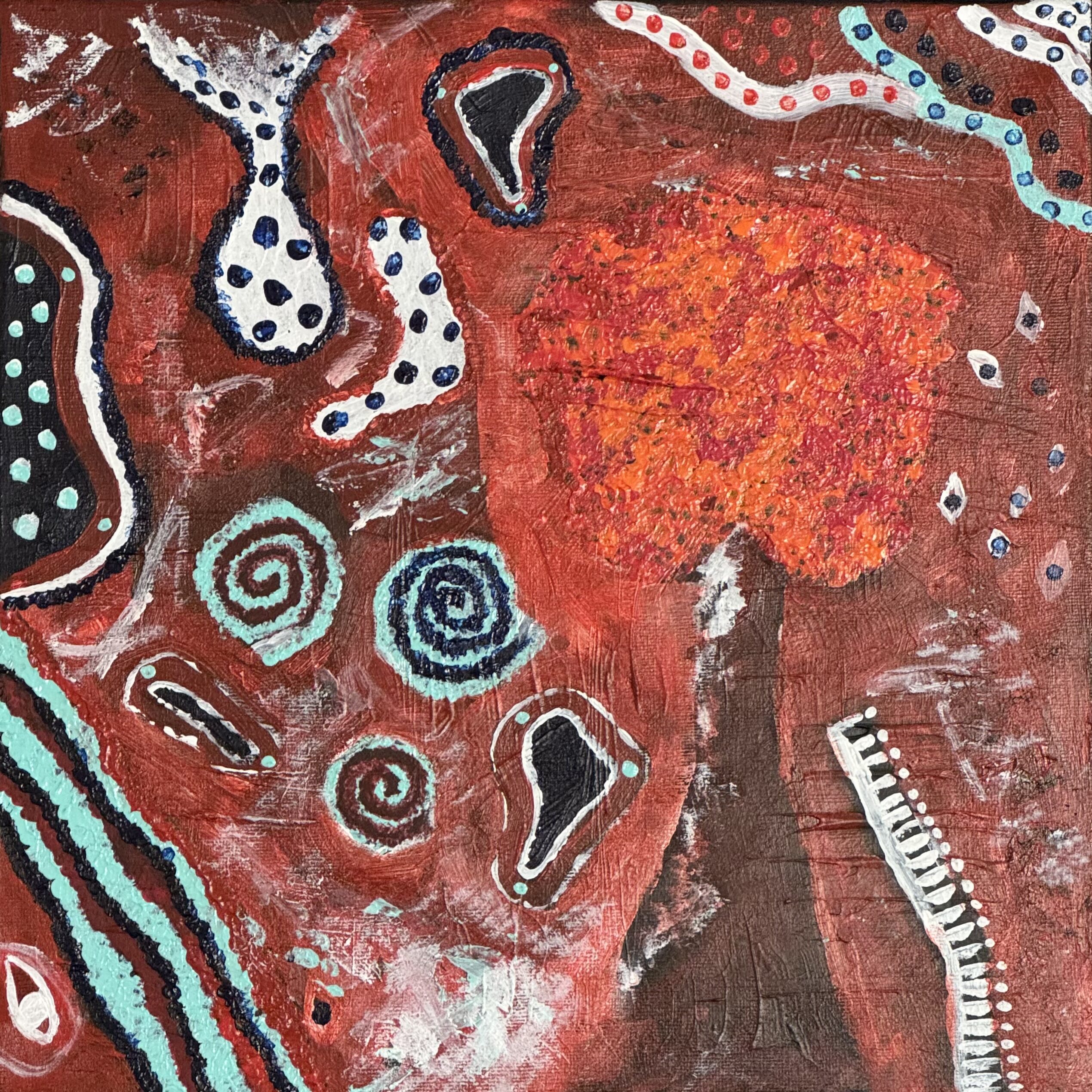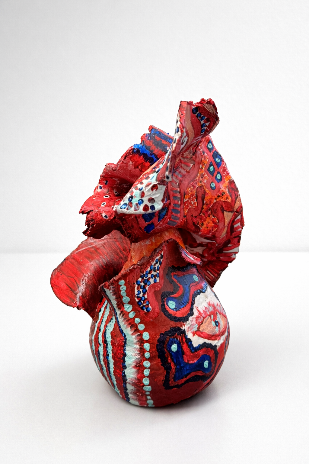 Genom spiraler, strukturer och intensiva röda toner gestaltar Spår av röd ett inre landskap där något ständigt växer och förändras.